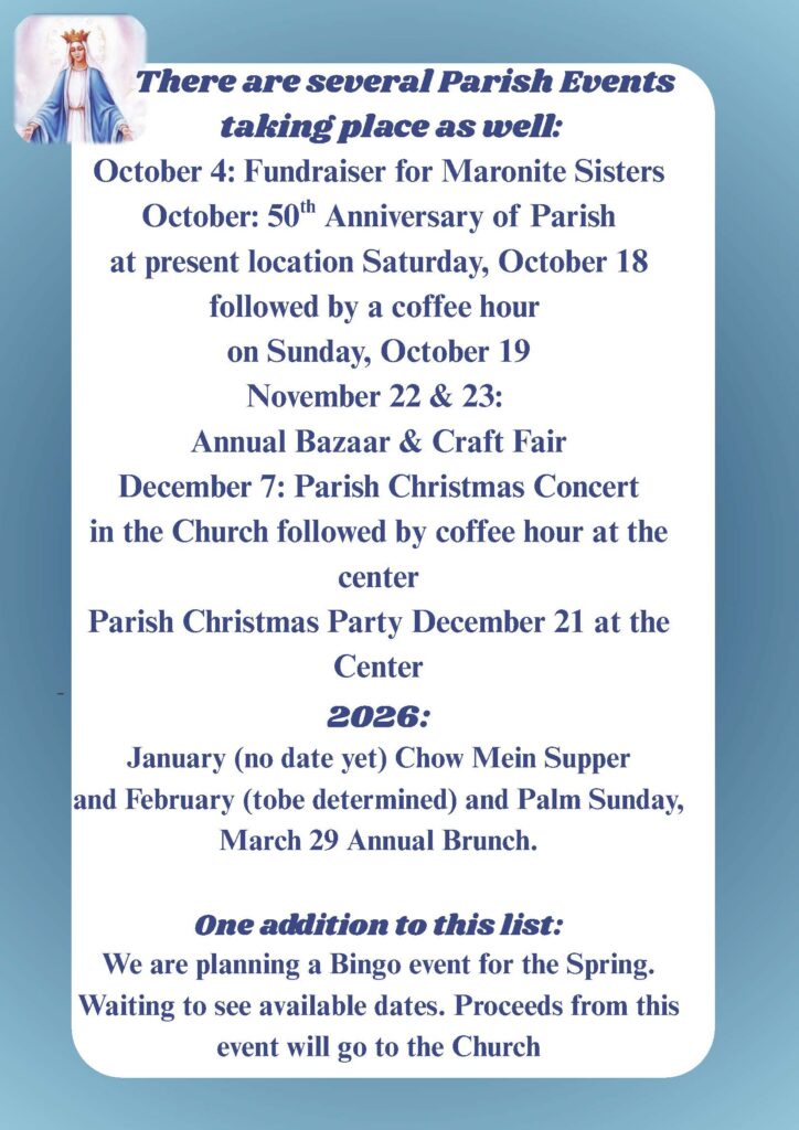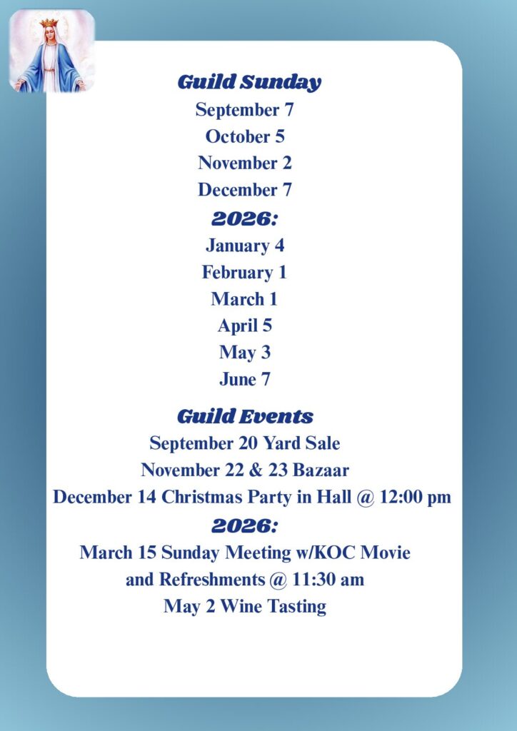 2025-2026 Blessed Mothers Guild Meeting ScheduleBlessed Mother’s Guild OfficersTerry Galib, PresidentPalmira Aguiar, Vice PresidentSamya Brownell, Recording SecretaryVeronica Abdallah, Treasurer